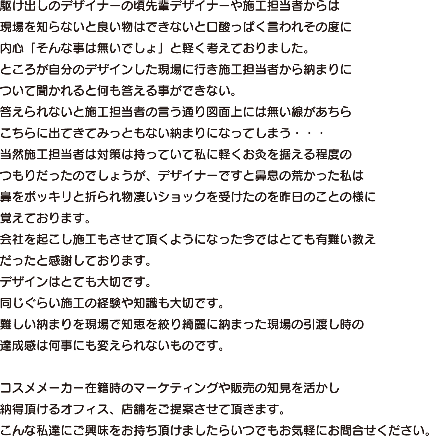 デザイナー出身の代表中島を始め私達は拘りの強い集団です。 デザインは言うに及ばず現場でのちり(小さな段差)一つにもミリ単位で拘ります。当たり前の事かもしれませんがそれを徹底出来ることが結局はお客様の満足に繋がると分かっているからこそ徹底的に拘ります。 同業他社様からのヘルプ案件の多さが私達の拘りの証です。 出来ない事は無いをモットーにお客様の問題、ご要望に拘りを持ってお応えします。